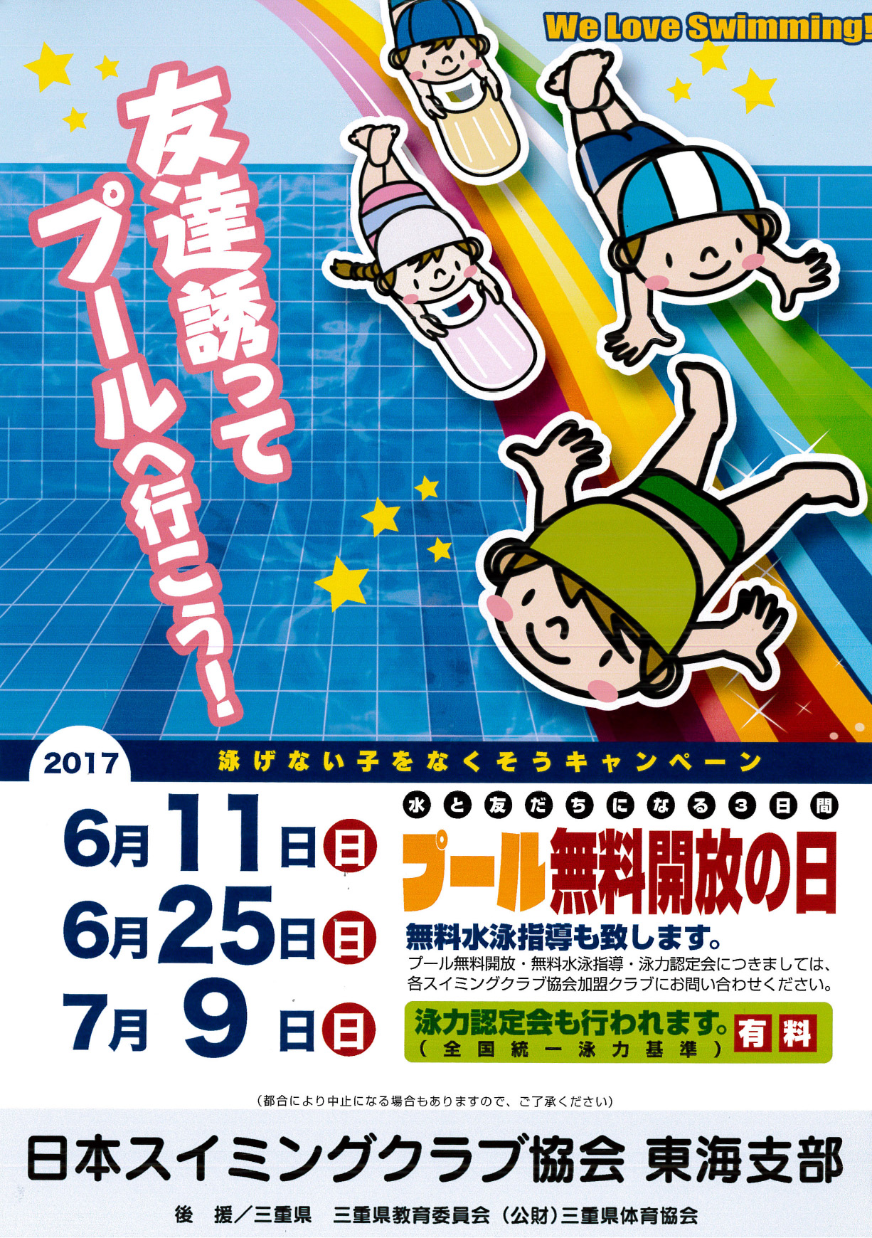 昨今のお子様たちの生活環境では、運動をする機会が少なくなってきております。特に泳ぐ環境につきましては、かなり狭まっており、年々泳力低下の傾向にあります。毎年悲しい水難事故が発生している事も事実です。当協会では、「泳げない子どもを無くそう」キャンペーンを実施し、水難事故撲滅を目指します。三重県全地域、協会加盟13のクラブで無料開放、無料水泳指導を行いますので奮ってご参加ください。なお、あらかじめ各クラブにお問い合わせの上ご来場ください。